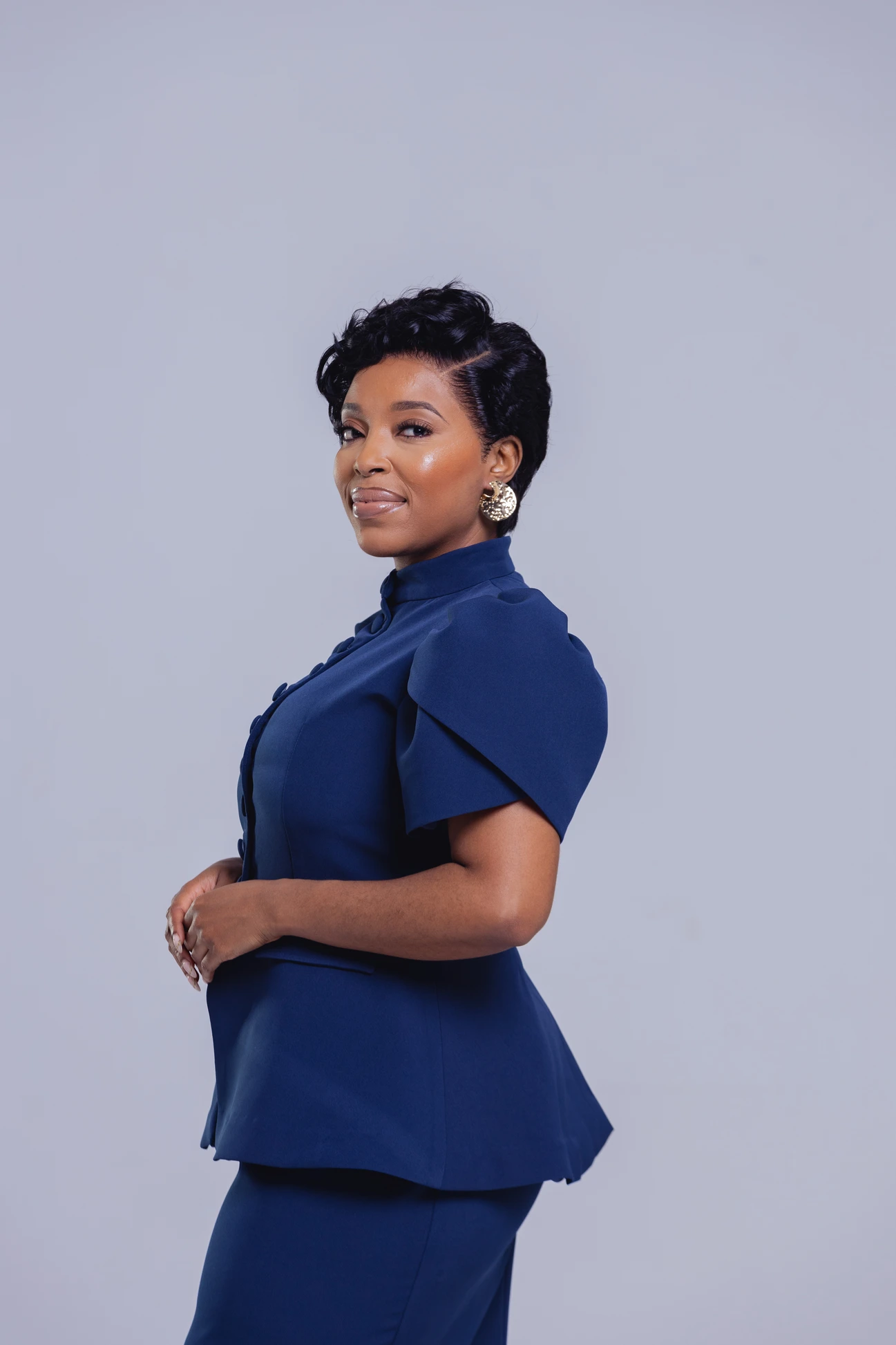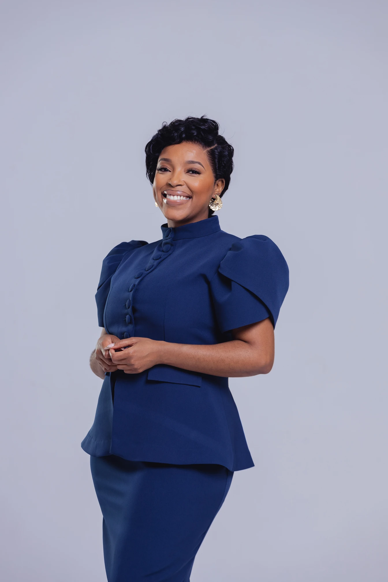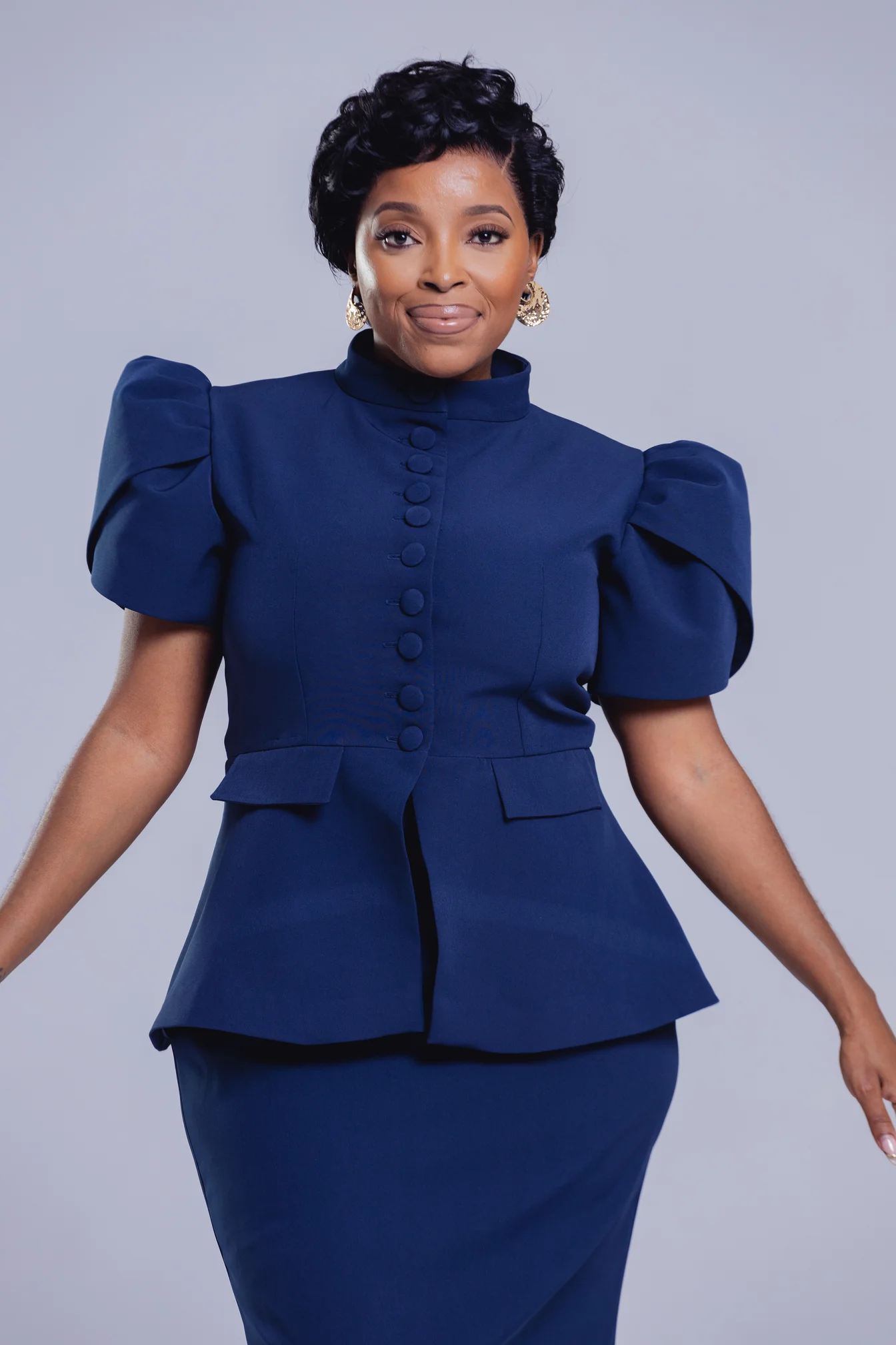 Command the room with the Midnight Elegance Puff-Sleeve Set — where structured sophistication meets modern femininity. Featuring a high mandarin collar, covered buttons, and bold puff sleeves paired with a sleek midi pencil skirt.