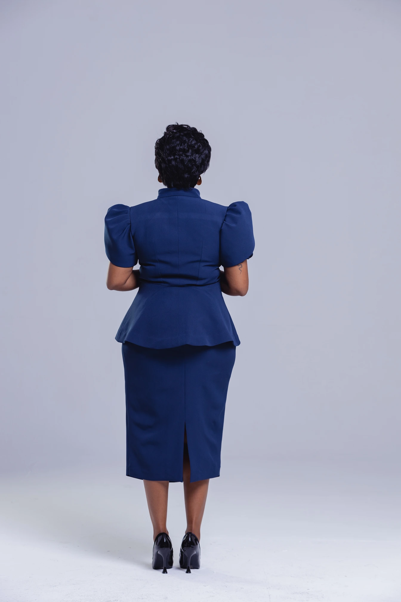 • Set Includes: Structured puff-sleeve top & midi pencil skirt