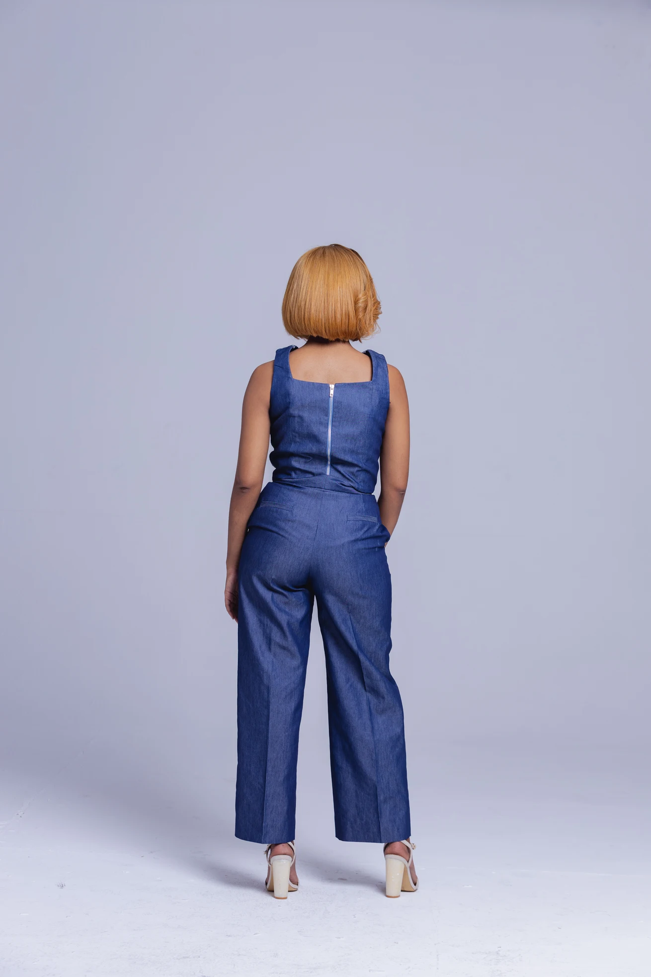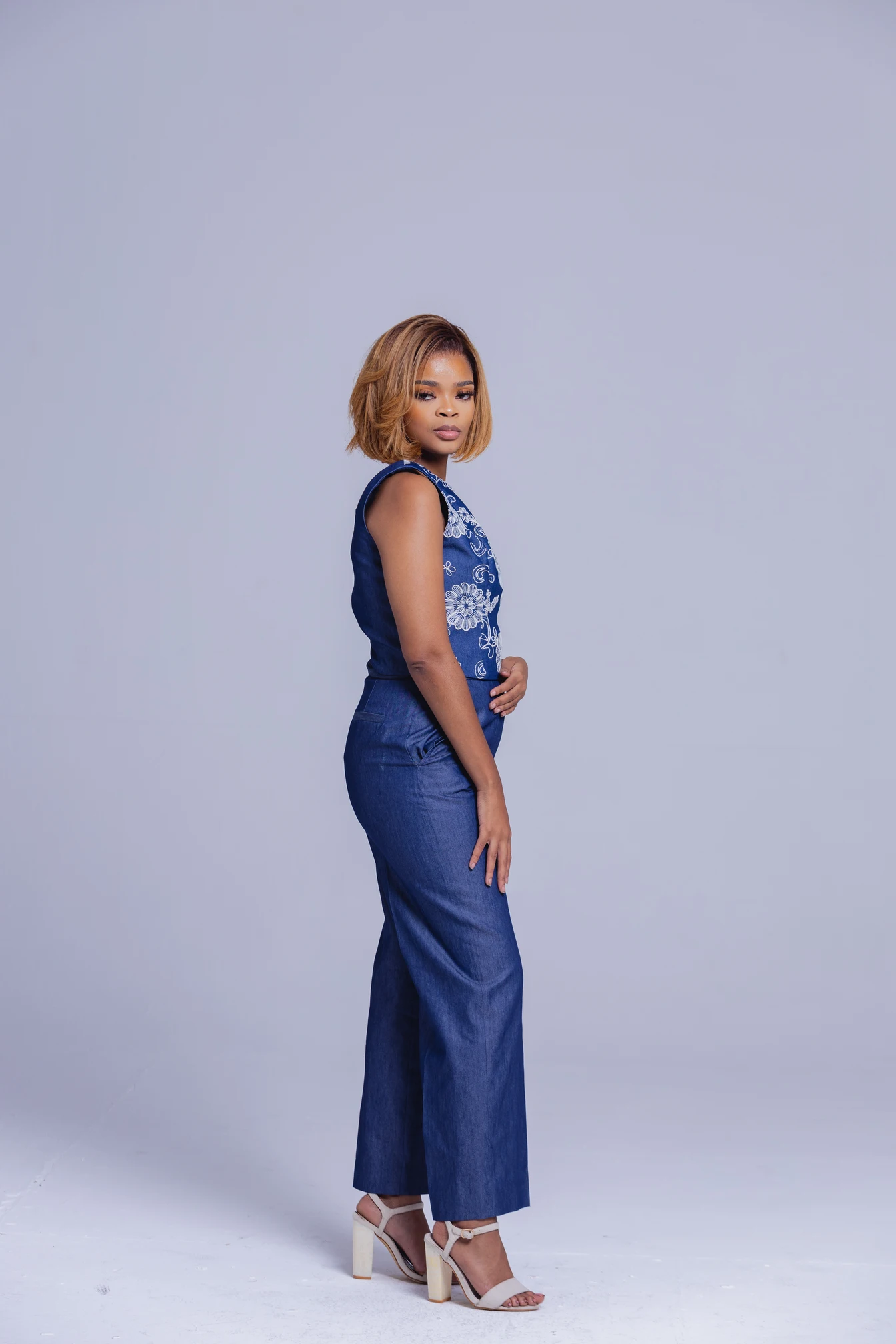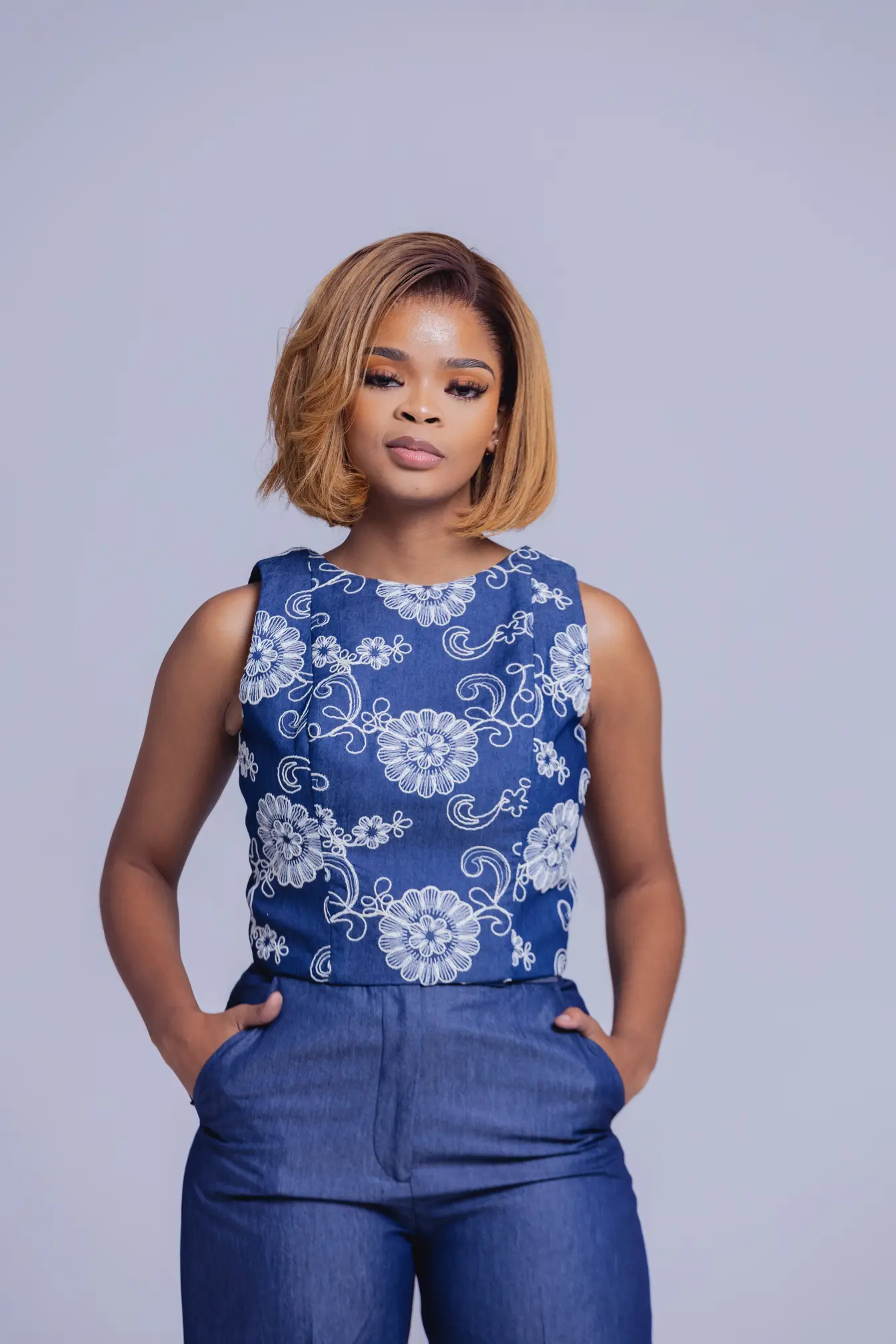A sophisticated blend of comfort and confidence, the Indigo Grace Ensemble pairs a delicately embroidered sleeveless top with wide-leg denim trousers. The intricate lace detailing adds a soft feminine edge to the structured silhouette, creating an effortlessly refined daytime look.