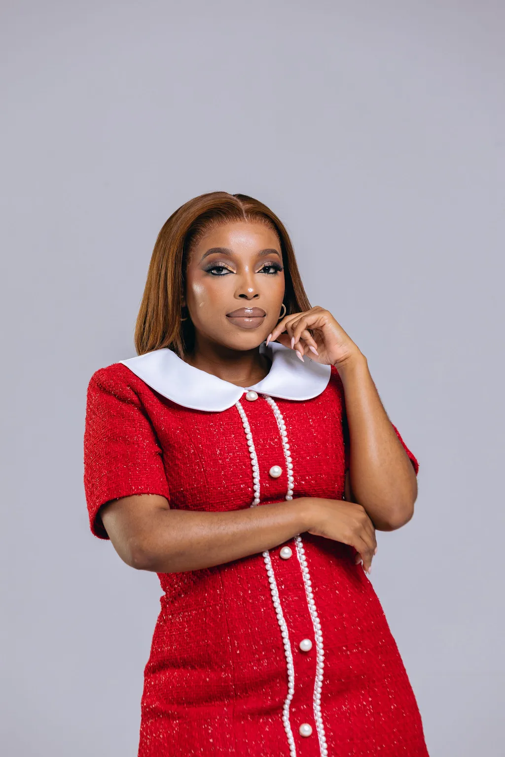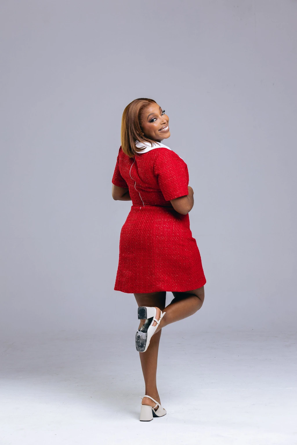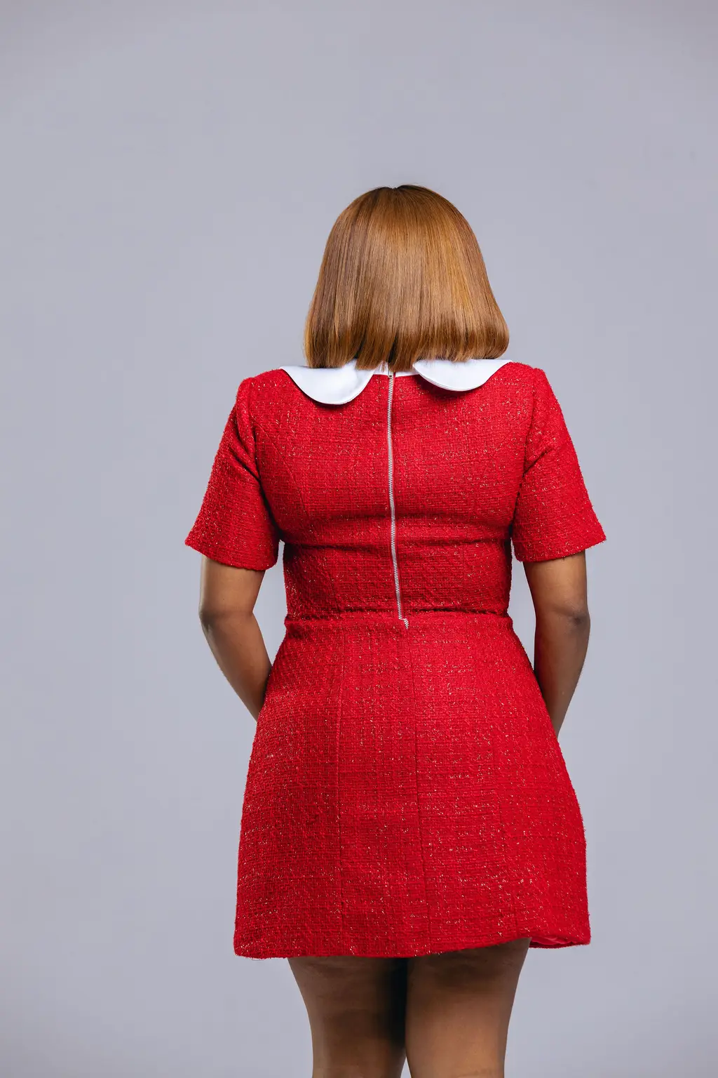 A classic tweed dress in vibrant red. It has a fitted, tailored silhouette with a defined waist and a large Peter Pan collar.